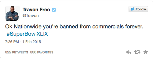 Did anyone else notice the not-so-funny tone of Super Bowl commercials this year? It seems like all of the advertising agencies got together and agreed to make viewers cry instead of laugh. Most notably, the Nationwide “Make Safe Happen” commercial. The ad features a little boy saying all of the things he couldn’t do, like learn to ride a bike or get “cooties” from girls. In the middle of all of the “awww”s from viewers, the little boy states, “I couldn’t grow up, because I died…” The viewers “awww”s quickly turned to shock and everyone shared a stunned expression similar to Richard Sherman’s.